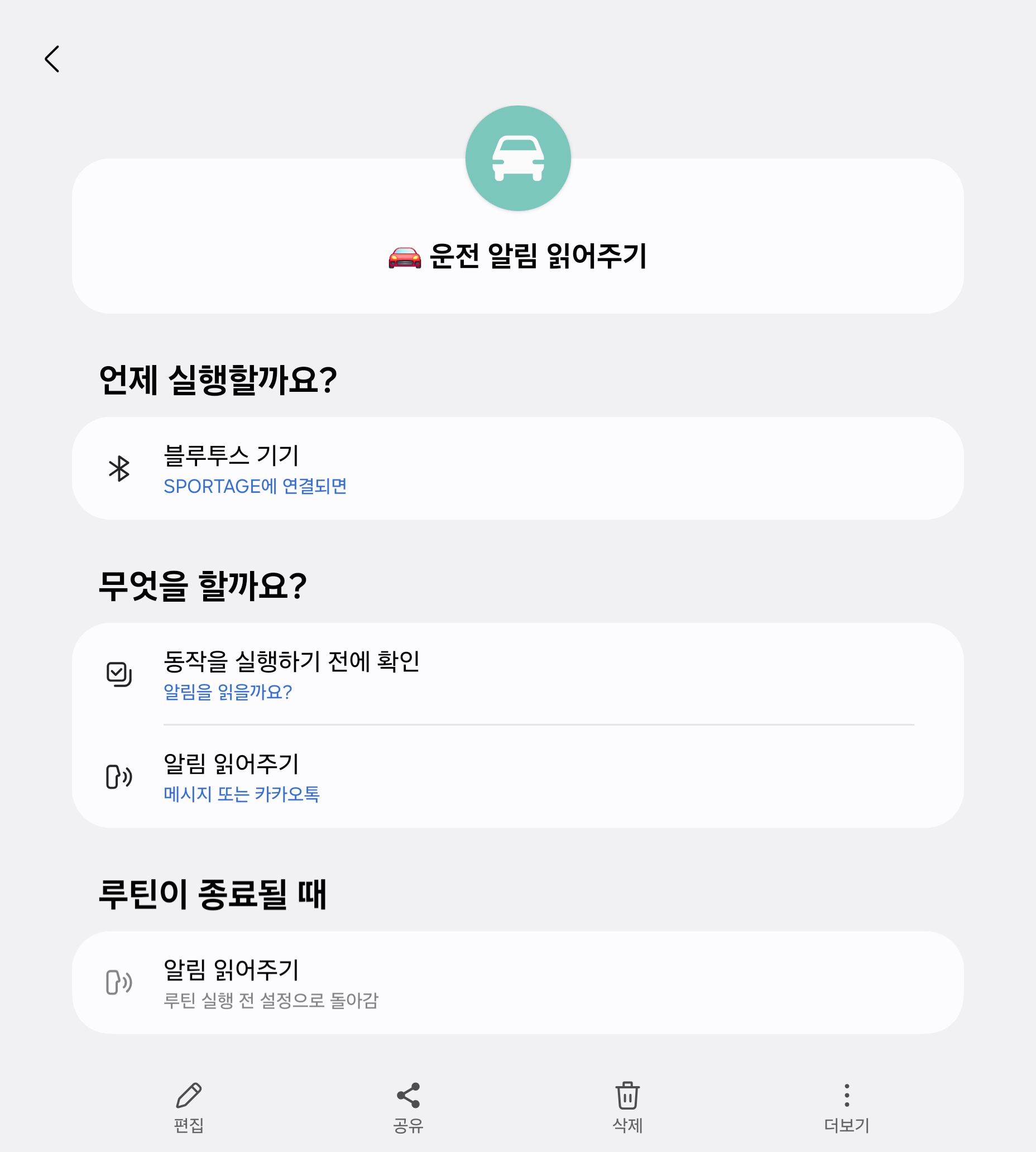 운전하다가 알림을 읽는 건 여간 불편한게 아닙니다. 그래서 카톡과 메시지가 오면 읽어두도록 해뒀습니다. 이 루틴의 특이한 점은 알림을 읽어줄 지 말지 여부를 선택하도록 했습니다. 만약 혼자 운전하는게 아닌 여러명이 차를 타고 가는 중인데 알림을 읽어주면 민망하잖아요. 그래서 이 선택권을 만들어 두었습니다.