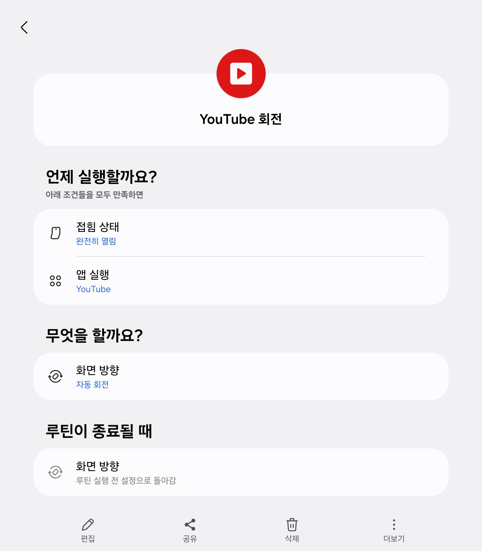 갤럭시 Z 폴드를 쓰시는 분들은 공감하실텐데, 폴드를 펼치고 유튜브 전체화면을 하면 가로로 회전이 안됩니다. 그래서 이 루틴을 만들었습니다. 유튜브 켜고 폴드를 펼치면 자동 회전이 되도록 하는 것이지요. 취향에 따라서 가로로 고정해도 유용합니다.