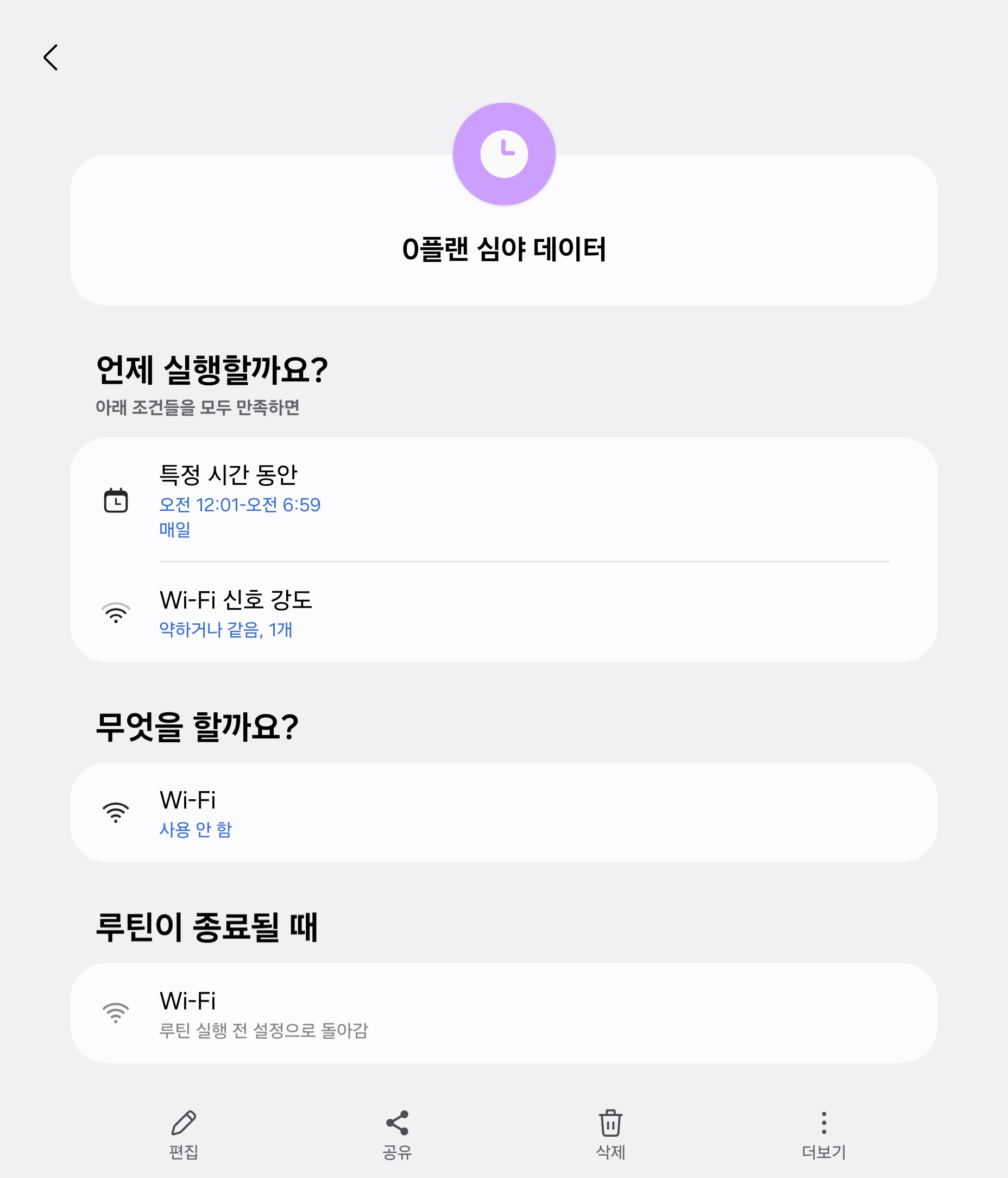 이건 SKT 사용자 중 20대만 해당되는건데 상당히 유용해서 소개합니다. 청년 전용 요금제 옵션 중에 심야에 데이터 무제한인게 있습니다. 그래서 저는 '심야'에 와이파이 '상태가 안좋으면' 와이파이를 끄도록 해놓았습니다.