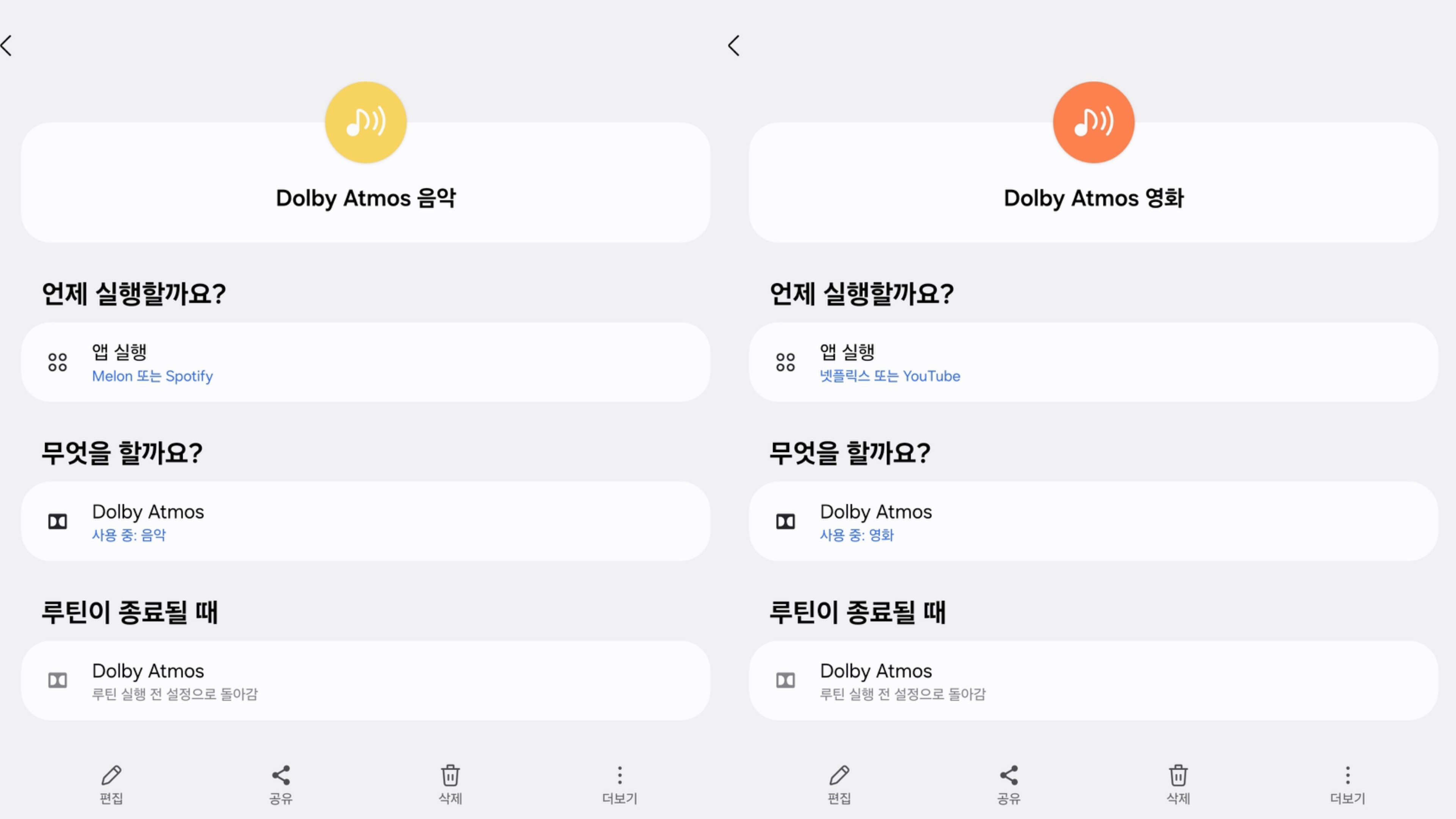 갤럭시에는 Dolby Atmos 기능을 지원합니다. 일반적으로 켜놓고 자동으로 두시는 경우가 많은데, 이렇게 앱마다 음악/영화로 바꿔놓으면 더 편리하고 음장효과를 경험할 수 있습니다. 그리고 돌비 애트모스 기능은 꼭 켜놓으시는 걸 추천드립니다. 확실히 소리가 달라집니다.