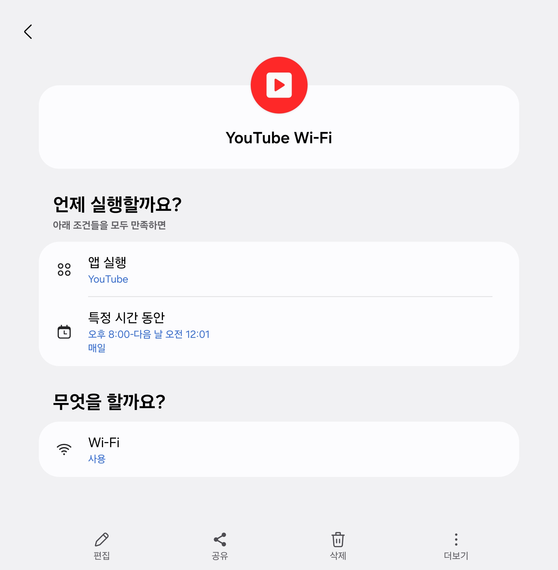 유튜브를 켜면 와이파이를 자동으로 켜둡니다. 저는 와이파이를 가끔 꺼두는데 유튜브를 볼때는 와이파이를 켜고 싶거든요. 그래서 만든 루틴입니다. 이렇게 해두면 데이터 걱정없이 유튜브 볼 수 있습니다. 삼성이 공식으로 넣어주면 좋을 법한 유용한 기능이라고 생각합니다.