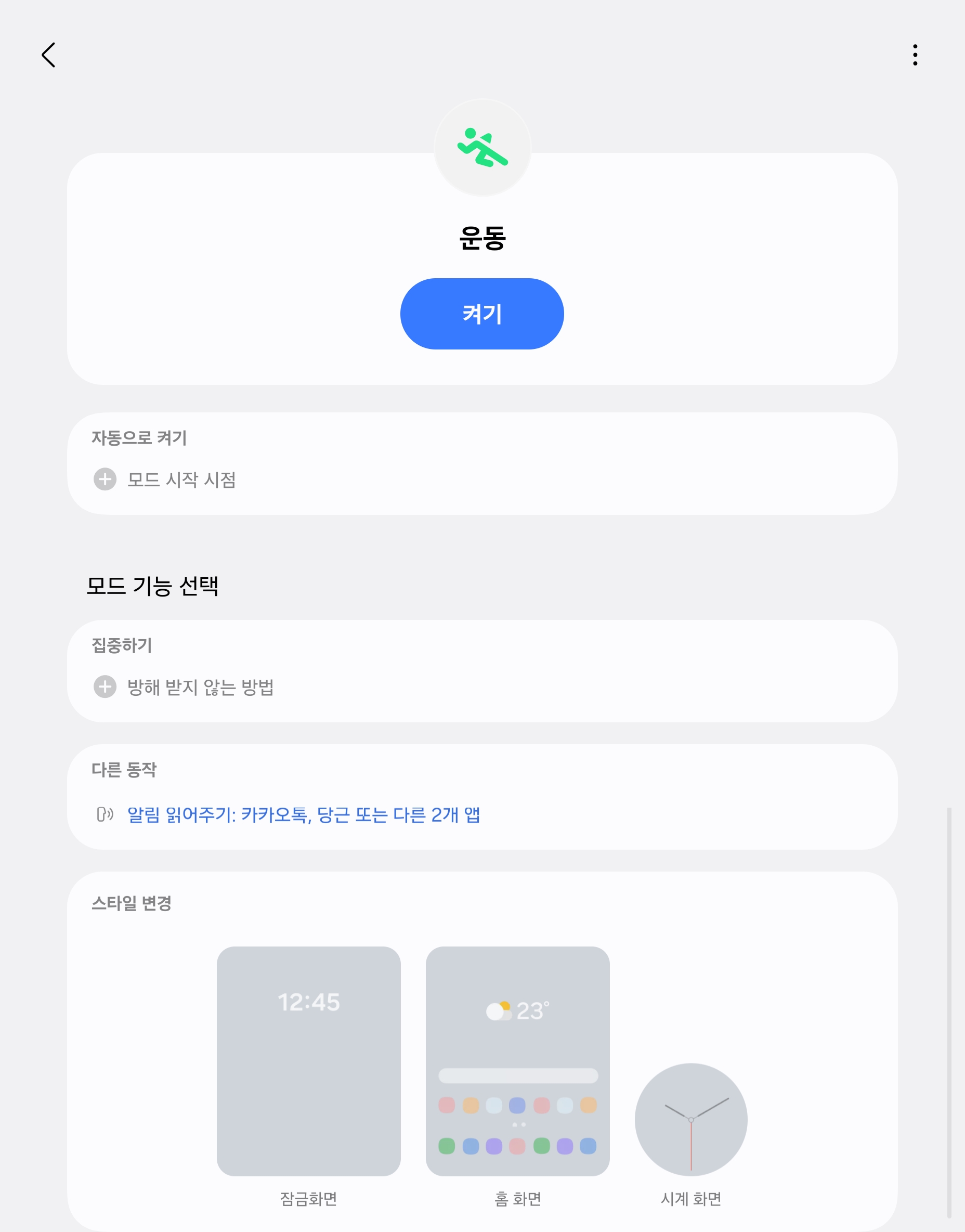 운동하면 카톡과 메시지, 당근에서 오는 알림을 이어폰으로 읽어주는 모드입니다. (저는 운동을 수동으로 시작하는 편이라 이렇게 설정했지만 ‘운동 중’ 조건으로 하시면 됩니다.)