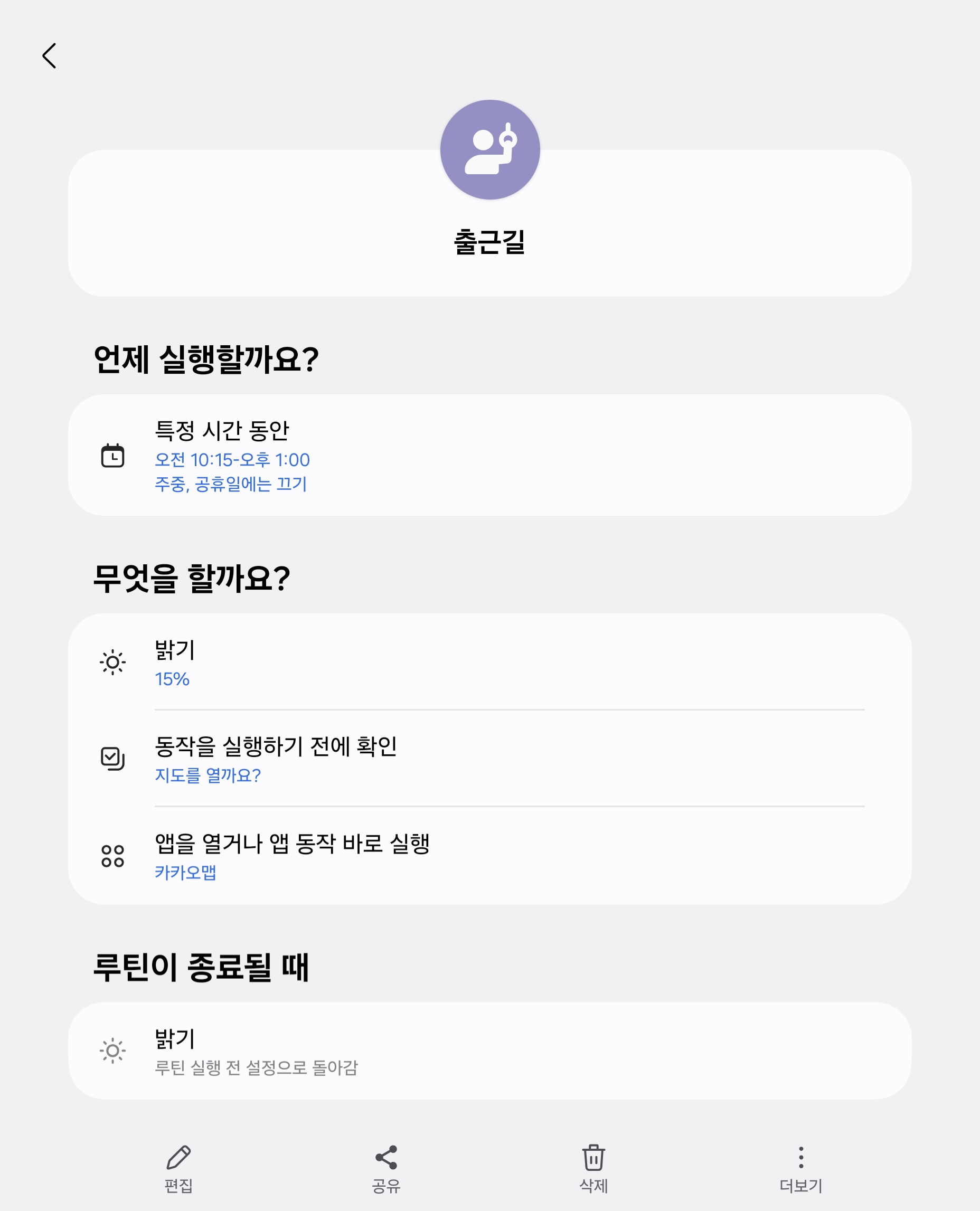 출근 시간에 맞춰 설정해둔 루틴입니다. 저는 버스와 지하철을 타고 출퇴근하는데 자동밝기로 하면 괜히 최대 밝기로 밝아져서 배터리만 빨리 닳고 마음에 안들어서 적정한 밝기로 고정해두었습니다. 그리고 카카오맵을 열 수 있도록 묻는 팝업이 뜨도록 해두었습니다. 당연히 지도앱이 바로 뜨도록 할 수 있지만, 제가 급한 일을 하고 있는데 시간이 되었다고 지도가 켜져버리면 낭패니까, 이렇게 팝업으로 묻는 방식으로 해두었습니다.